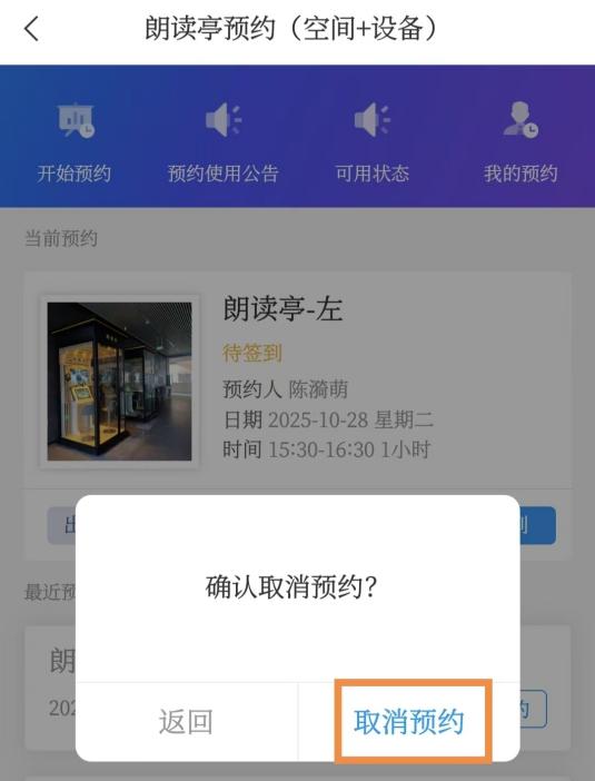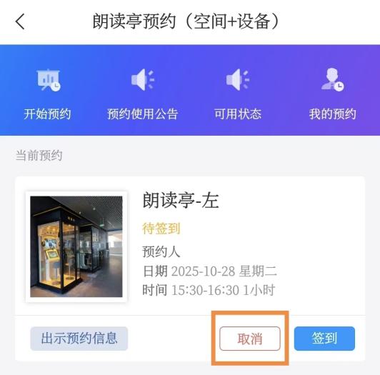 1.进入“朗读亭预约”页面,在“当前预约”模块预约记录的下方点击“取消”。