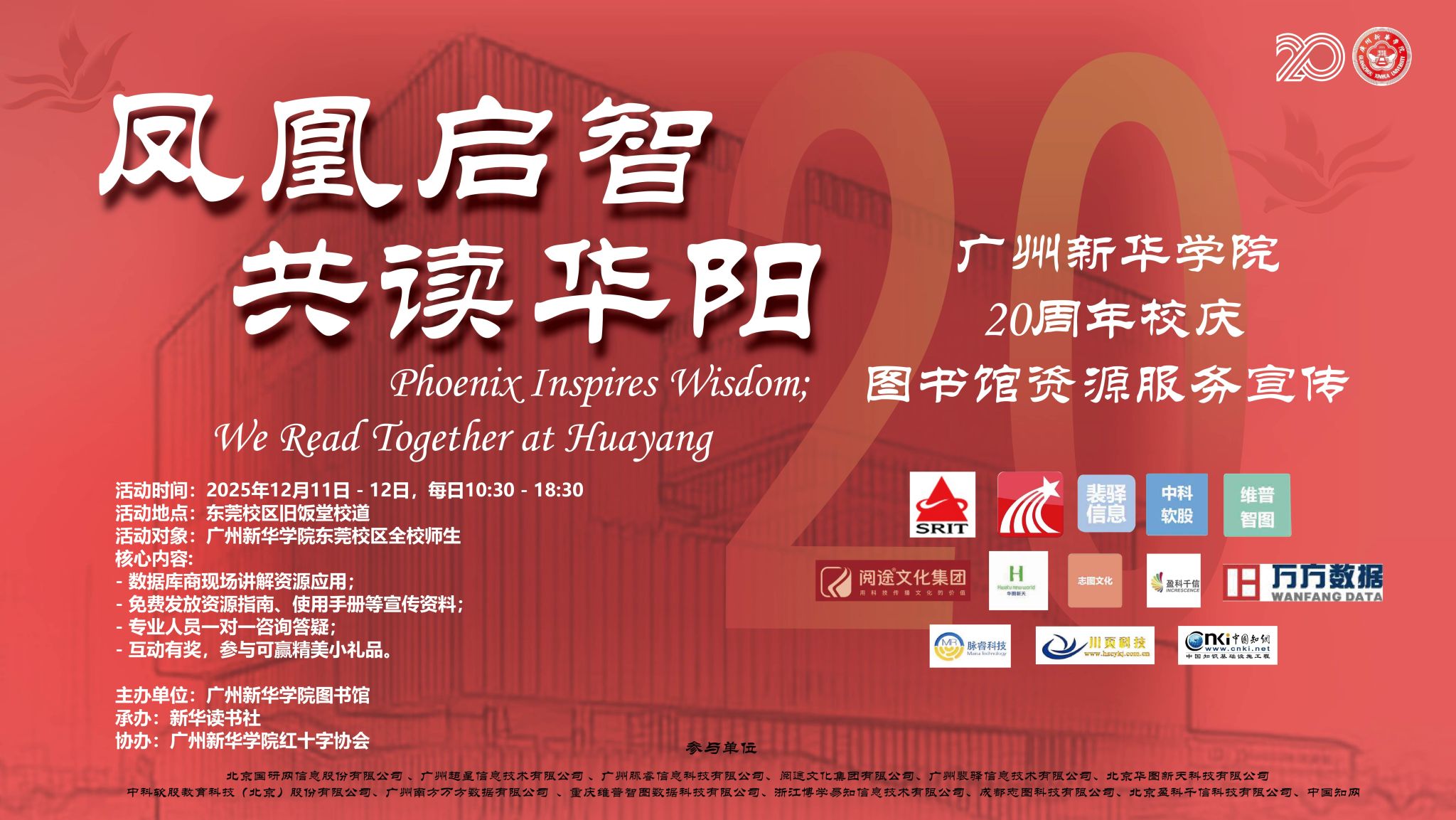 2025年是广州新华学院建校20周年校庆,图书馆作为学校学术资源中枢与知识服务平台,始终以“支撑教学科研、赋能人才培养”为核心,持续构建丰富多元的馆藏资源体系与数字服务矩阵。当前,部分师生对图书馆优质资源及特色服务的认知与利用仍有提升空间,为进一步激活资源价值、深化学术服务,借校庆契机搭建资源共享与交流平台,校图书馆特策划举办“凤凰启智・共读华阳——广州新华学院20周年校庆图书馆资源服务宣传”活动,助力师生更好地依托图书馆资源成长发展。现将有关事宜通知如下: