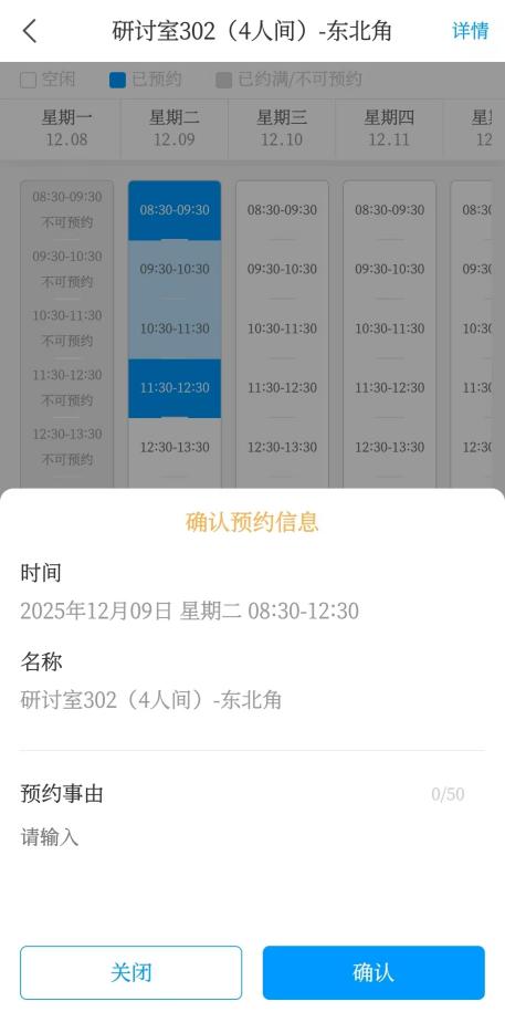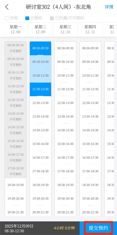 依次选择预约起始和结束时段,点击右下方的“提交预约”。