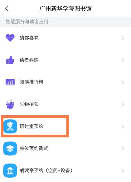 在“智慧服务与读者应用”模块中下滑找到“研讨室预约”并点击。
