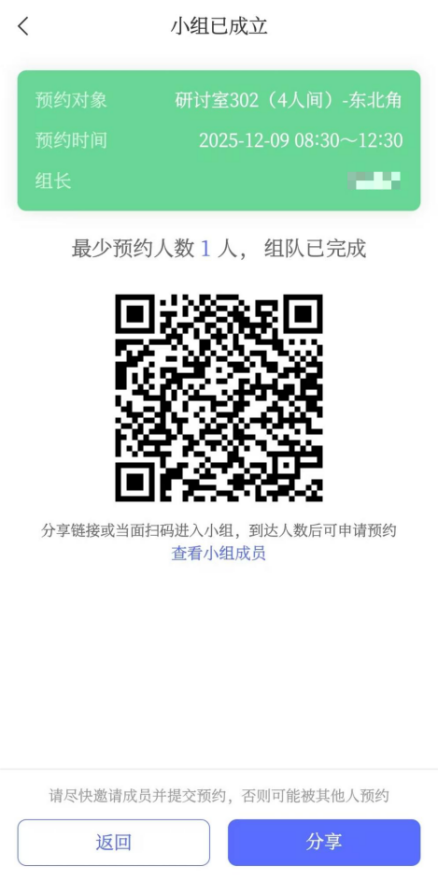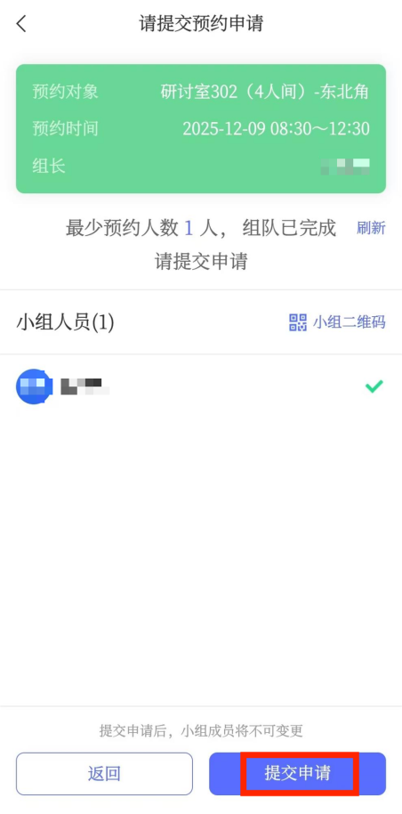 10.组队完成后,点击二维码下方的“查看小组成员”,再点击右下角的“提交申请”即可完成预约。