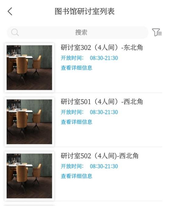 点击“开始预约”,进入“图书馆研讨室列表”,选择需要预约的研讨室(有4人间、6人间、8人间、12人间、14人间、15人间可供选择)。