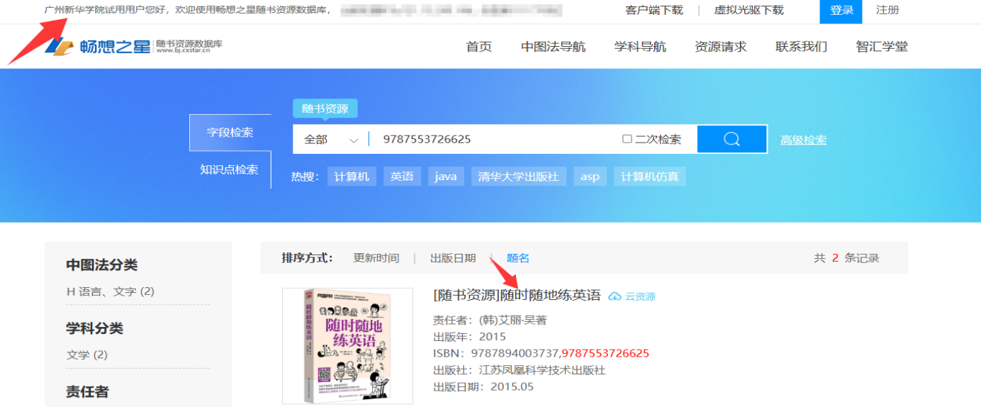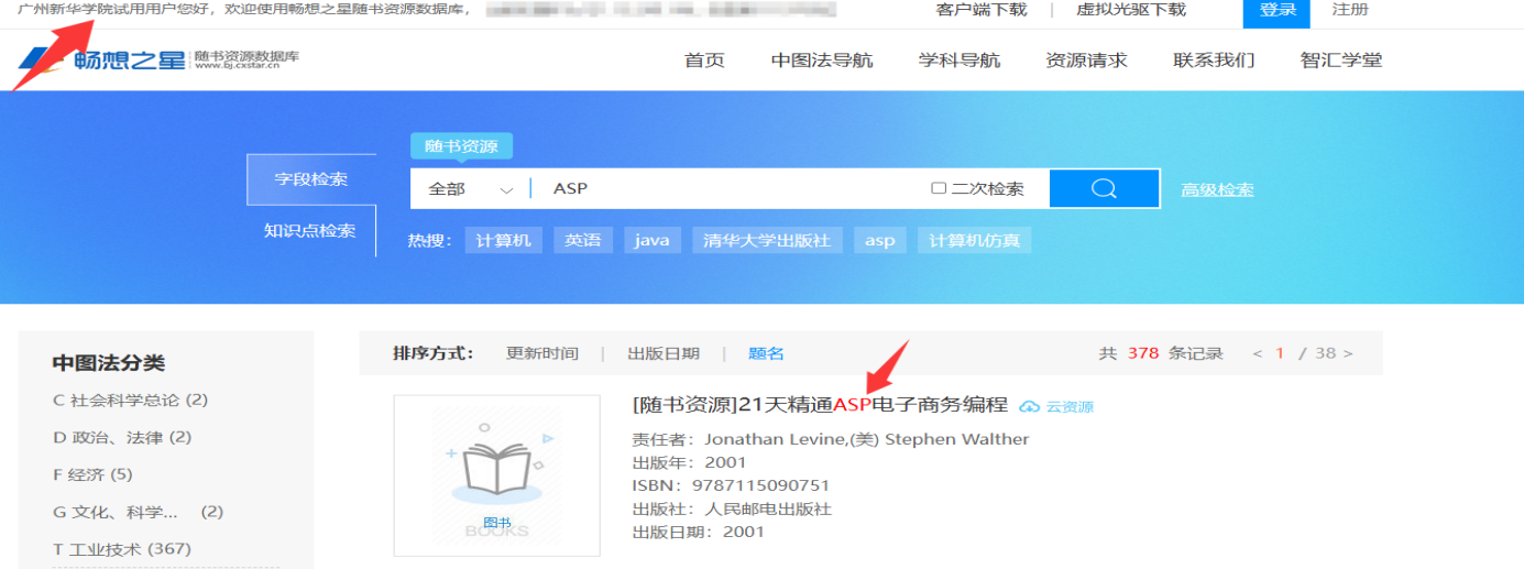1.广州新华学院融合门户登录→VPN→试用资源→《畅想之星随书资源数据库》