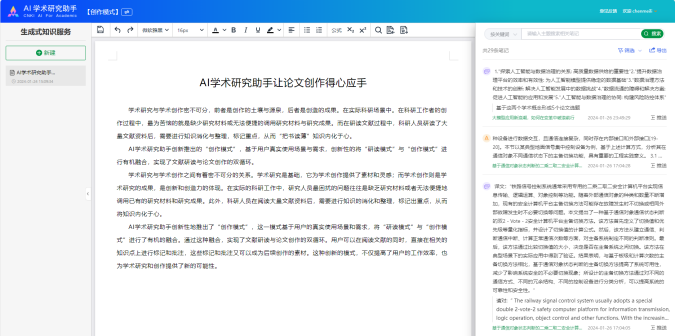 (1)资料研参:AI助手将研究与创作环节有机结合,实现高效创作。当用户在研读文献时,可便捷、系统地记录研读和问答中的文献精要和研究心得,为后期创作准备翔实的学术素材。当用户进入创作阶段,可便捷的将研读资料应用在论文创作中。