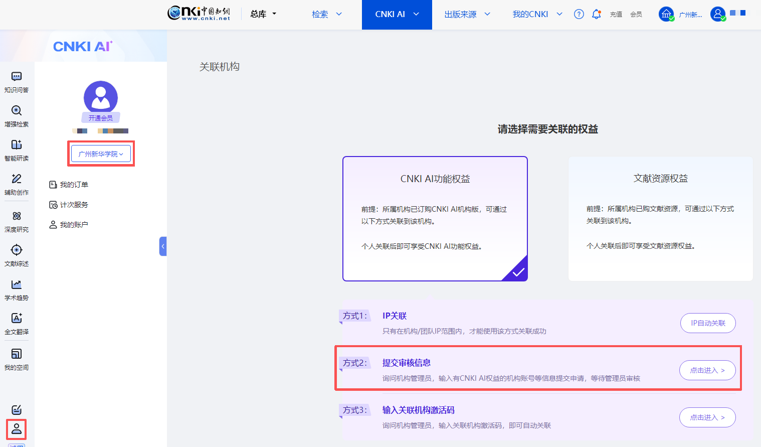 (1)点击左下角个人图标-关联机构,选择 AI 助手功能权益-提交审核信息(如下图)。