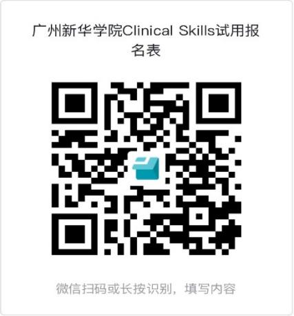 Clinical Skills采用主动申请试用的方式开通,须在校园网环境下,或通过广州新华学院新华企业微信-WebVPN找到该资源网址,提交试用申请信息可扫下方二维码进行申请。