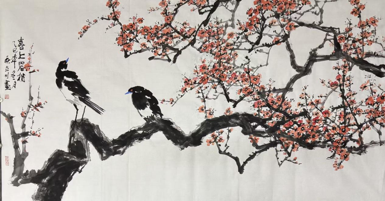 作品笔墨痛快淋漓,梅干的苍劲厚重与喜鹊的轻盈灵动形成鲜明对比,让画面刚柔互补;淡彩点染梅花,墨色细腻刻画喜鹊羽翼,更添朴拙自然之美。“喜上眉梢(梅梢)”的吉祥寓意,与画面的雅致笔墨完美融合,没有俗套的喜庆感,反而尽显文人画的意趣与格调。艺术类专业同学可学习:吉祥题材的雅化处理、花鸟题材的笔墨对比、文人画意境的营造;普通读者则能在喜庆氛围中,感受传统书画的雅致之美,收获一份舒心与愉悦。