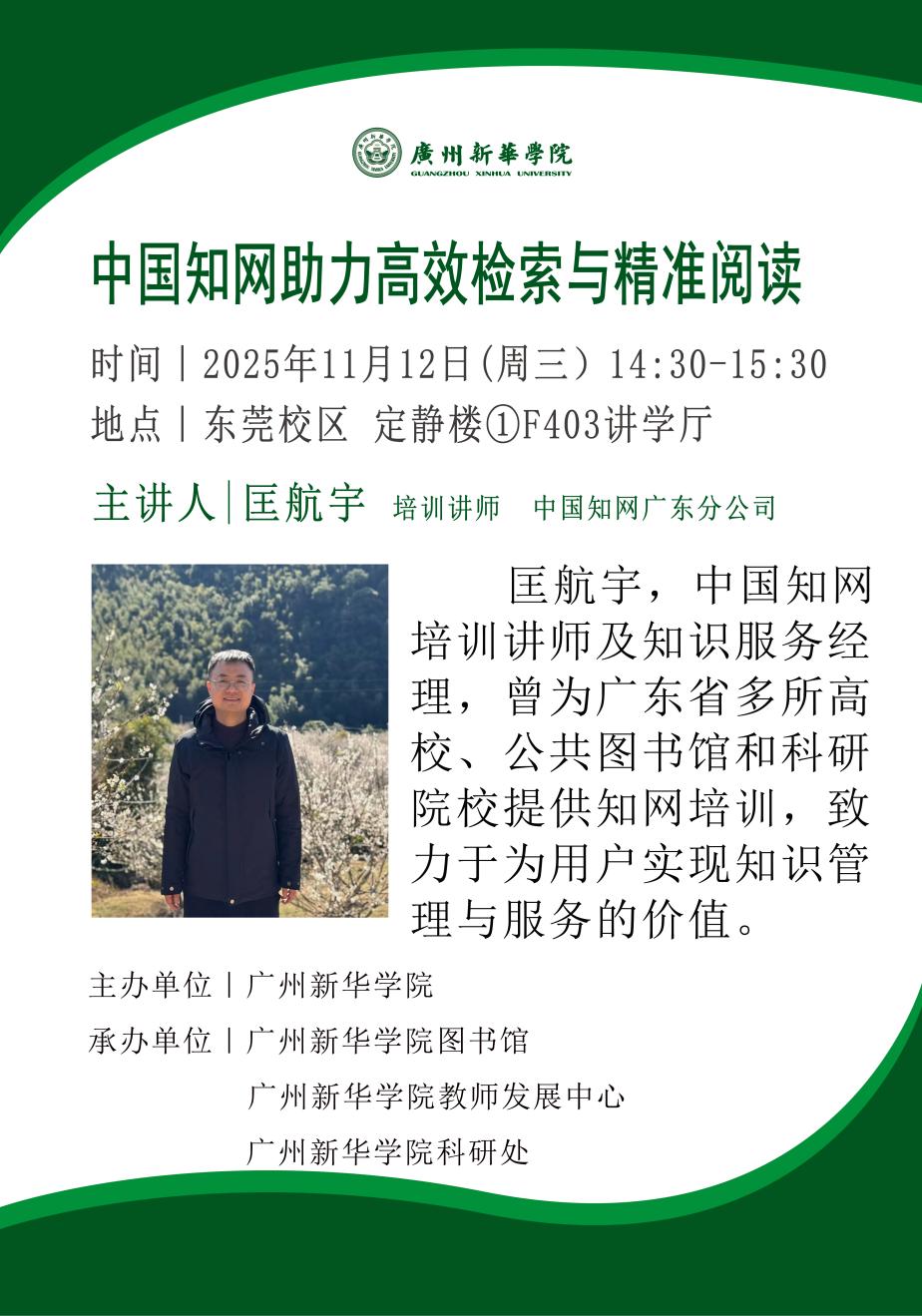 匡航宇,中国知网培训讲师及知识服务经理,曾为广东省多所高校、公共图书馆和科研院校提供知网培训,致力于为用户实现知识管理与服务的价值。