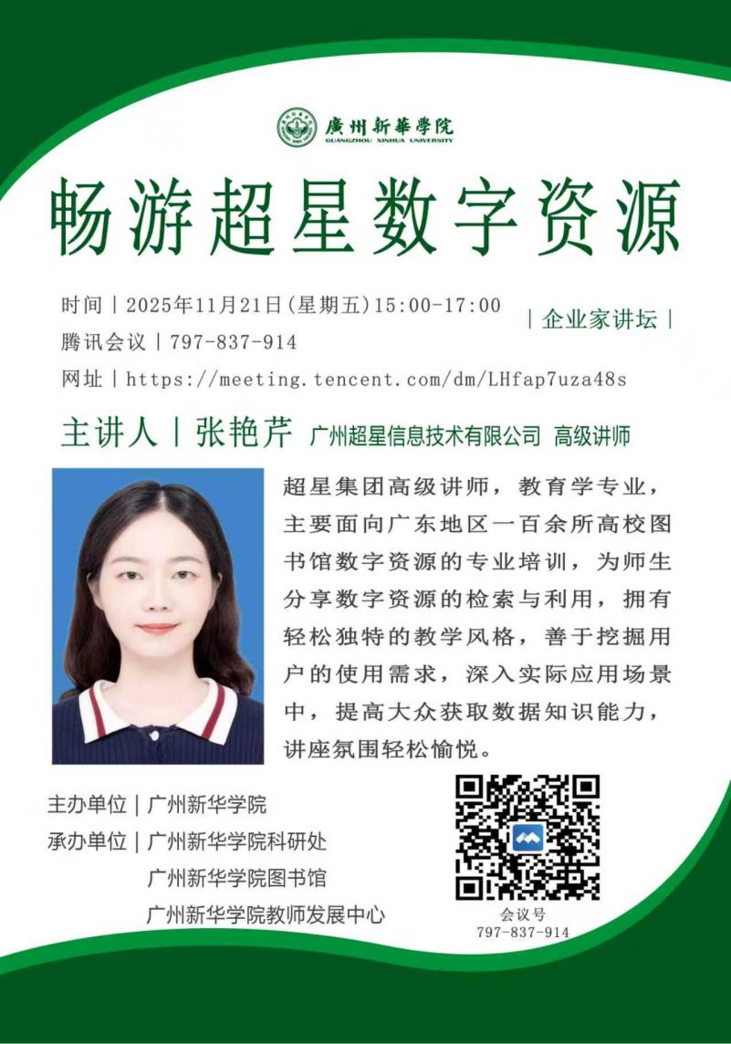 张艳芹,超星集团高级讲师,教育学专业,主要面向广东地区一百余所高校图书馆数字资源的专业培训,为师生分享数字资源的检索与利用,拥有轻松独特的教学风格,善于挖掘用户的使用需求,深入实际应用场景中,提高大众获取数据知识能力,讲座氛围轻松愉悦。