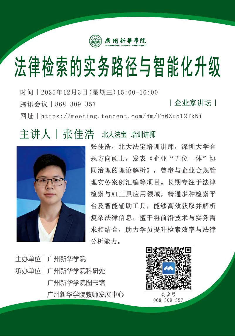 张佳浩,北大法宝培训讲师,深圳大学合规方向硕士,发表《企业“五位一体”协同治理的理论解析》,曾参与企业合规管理实务案例汇编等项目,张老师长期专注于法律检索与AI工具应用领域,精通多种检索平台及智能辅助工具,能够高效获取并解析复杂法律信息,擅于将前沿技术与实务需求相结合,助力学员提升检索效率与法律分析能力。