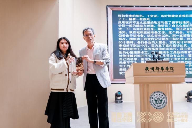 论坛接近尾声,最令人期待的下联评选结果正式揭晓。来自中文系的一位同学以“凤凰飞舞 旭日东升”脱颖而出,赢得全场掌声。“‘华阳’对‘东升’,既呼应了校庆的朝气,又暗含‘生活向上、梦想升腾’的寓意,对仗工整且意境深远!”南翔盛赞道,并亲手将带着墨香的未刊打印版书稿与签名赠予该同学,鼓励大家“永远保持对文字的热爱,让文学成为生活的底色”。