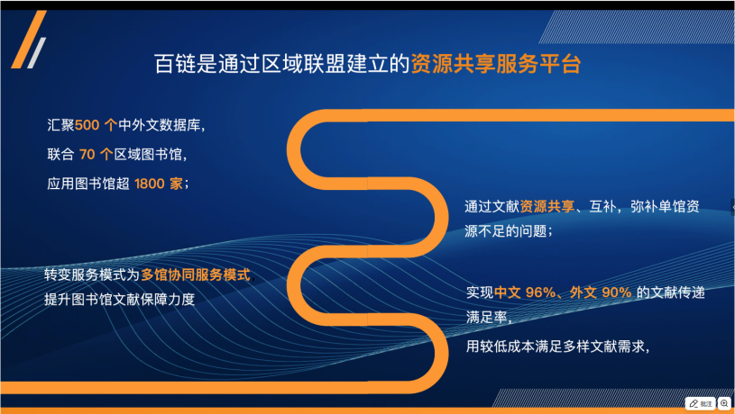 百链云图书馆依托500余个中外数据库,是图书馆馆藏资源的有力补充,其中文文献传递成功率高达96%。此外,百链云图书馆新上线了“百链智能体”AI助手,师生可通过自然对话快速获取文献、推荐期刊,极大提升了检索效率。