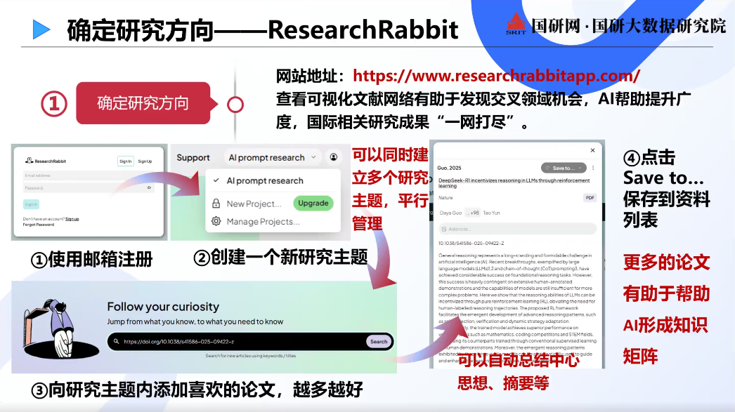 在“学术研究全流程概述与AI应用”部分,王海涛结合多个AI工具,生动演示了从选题定位、文献调研到研究设计、数据处理与成果优化的全链条效率提升路径。他推荐了ResearchRabbit、Elicit等智能文献工具,帮助师生快速构建知识网络、生成文献综述;同时介绍了DeepSeek在研究设计与文本优化中的应用,强调“人机协同”在提升研究逻辑与表达能力方面的重要价值。