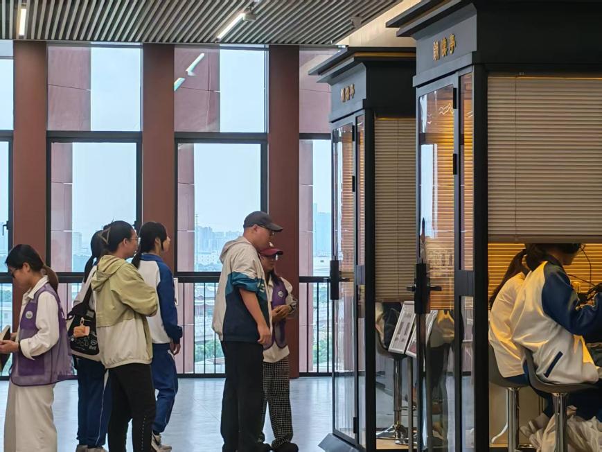 最热闹的当属朗读亭:透明玻璃隔绝喧嚣,专业麦克风、降噪耳机与高清显示屏打造“专属舞台”。志愿者在旁协助调试设备、推荐朗读篇目,学子们推门而入,戴耳机、握话筒,清亮嗓音裹着真挚情绪漫开——或柔婉诵诗词,将“明月松间照”的静谧读得身临其境;或激昂读散文,传递少年热忱;或搭档演绎话剧片段,让静态文字变鲜活场景。亭外志愿者维持秩序,与等候同学一同静静倾听、无声点赞,小小的朗读亭里,文字因声音焕发生机,少年因朗读绽放光芒。