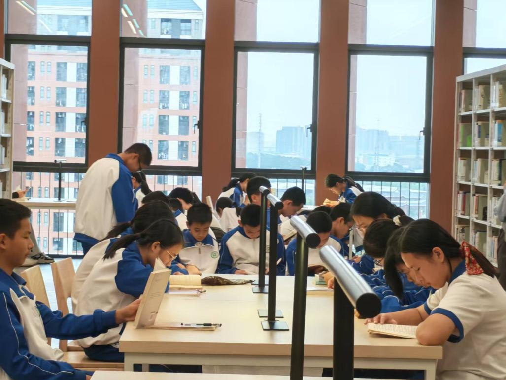 踏入新图书馆6楼,暖黄灯光漫过整齐书架,纸张特有的油墨香扑面而来,学子们的目光瞬间被满架书籍点亮。在图书馆老师及志愿者的贴心引导下,大家有序散开:志愿者们耐心指引书架分区,帮同学查找书籍、解答疑问,还分享阅读小贴士;学子们或三五成群围坐阅览桌,轻抚经典文集书脊低声交流;或踮脚穿梭书架间,细阅青少年文学与科普读物,偶因发现好书轻呼;或席地背靠书架,沉浸文字世界,眉眼随情节起伏。翻页沙沙声、轻声讨论与志愿者的温柔讲解交织,勾勒出静谧惬意的阅读图景。