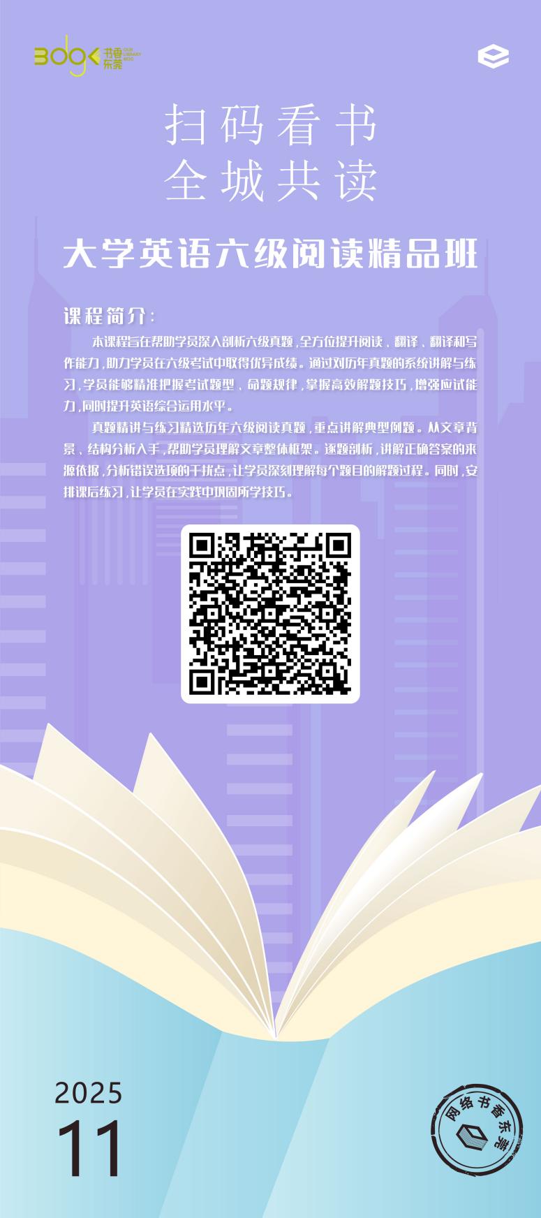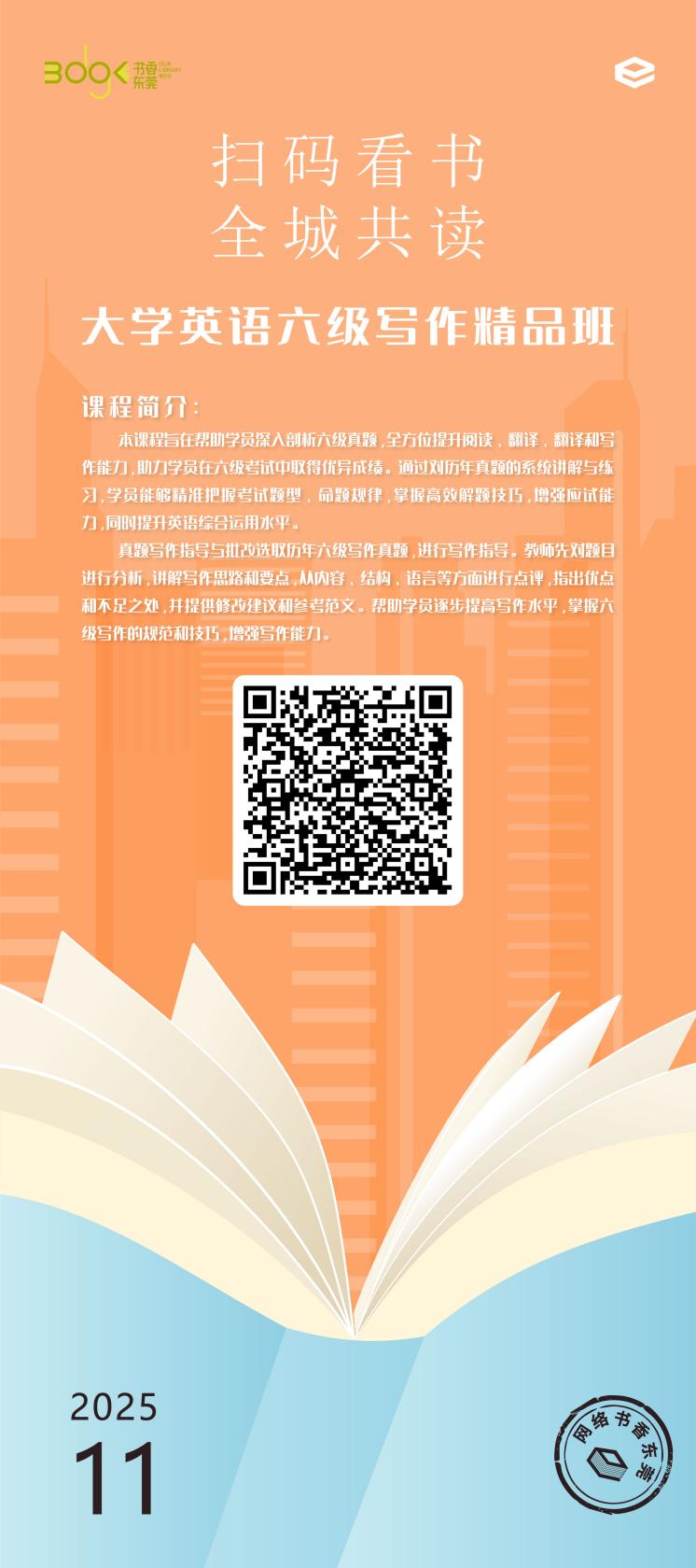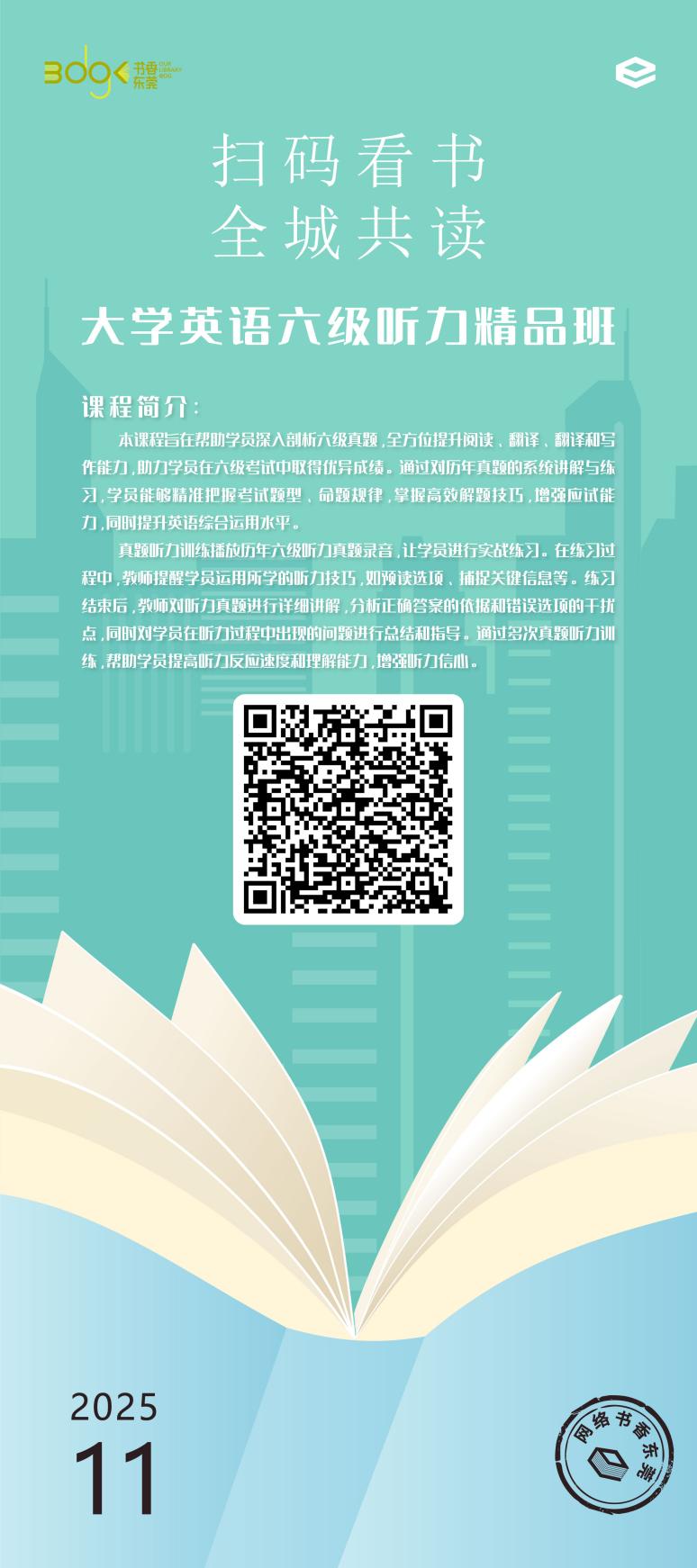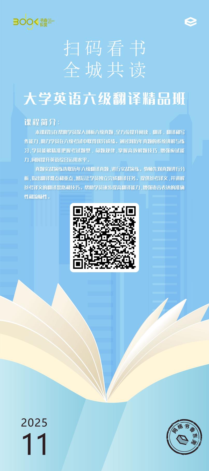 本课程旨在帮助学员深入剖析六级真题,全方位提升阅读、翻译、翻译和写作能力,助力学员在六级考试中取得优异成绩。通过对历年真题的系统讲解与练习,学员能够精准把握考试题型、命题规律,掌握高效解题技巧,增强应试能力,同时提升英语综合运用水平。